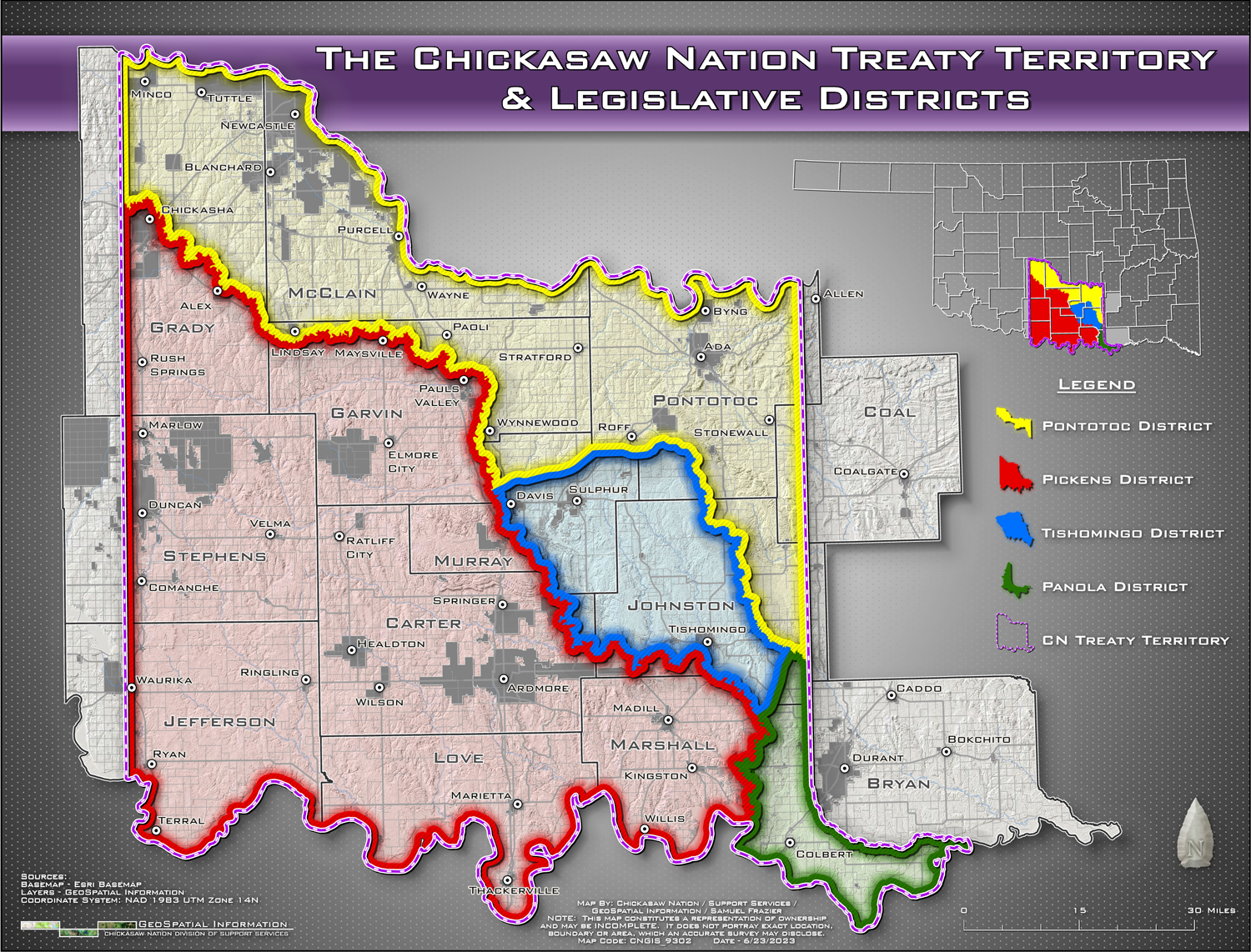 The Chickasaw Constitution of 1983 retained the same boundaries but labeled them as “Districts.” The Constitution provides that the total number of Legislators is 13, that each District shall have at least one Legislator and that the apportionment among the districts is based upon the number of registered living in or affiliating with each district unless the Tribal Legislature adopts some other apportionment plan.